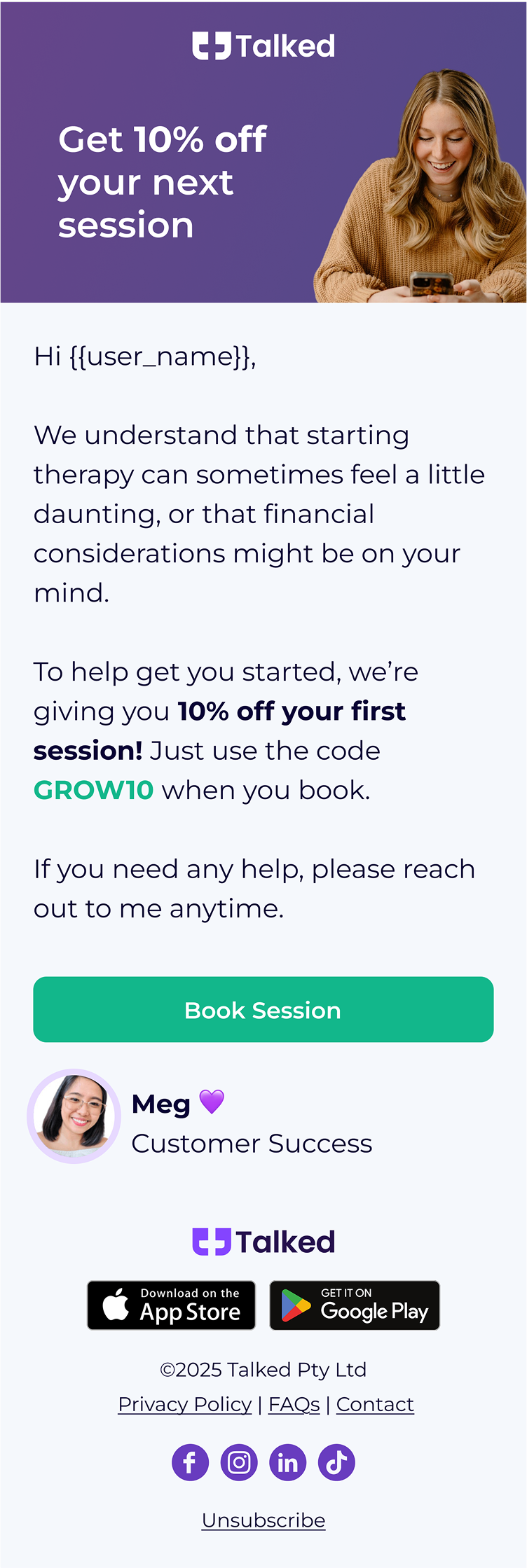 e.g. “10% off your first session!”